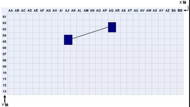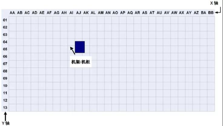 在數(shù)據(jù)中心,機柜和機架的位置和布局可以根據(jù)活動地板的劃分進行組織和標(biāo)記。根據(jù)ANSI/TIA/EIA-606-A標(biāo)準(zhǔn),數(shù)據(jù)室應(yīng)使用兩個或兩個字母,每個600mm*600mm活動地板用阿拉伯?dāng)?shù)字標(biāo)識。在數(shù)據(jù)中心機房平面圖上建立X、Y坐標(biāo)系的網(wǎng)格,用字母標(biāo)記X軸,用數(shù)字標(biāo)記Y軸,建立坐標(biāo)原點。機架和機柜的位置基于它們在網(wǎng)格地圖上的正面坐標(biāo)。標(biāo)注如下圖 2所示